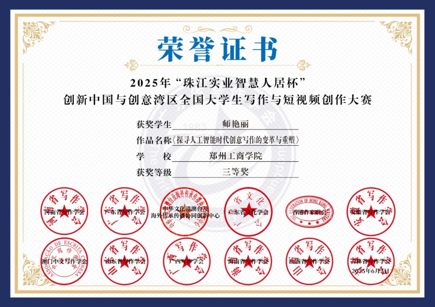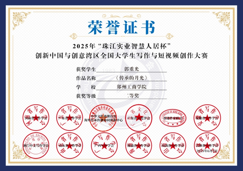 近日,2025年“珠江实业智慧人居杯”创新中国与创意湾区全国大学生写作与短视频创作大赛圆满落幕。必赢76net线路官网组织我校学生积极参与该项赛事,多名学子在比赛中表现优异,斩获多个奖项,充分展现了我校学子扎实的文学素养与深厚的文化表达力。